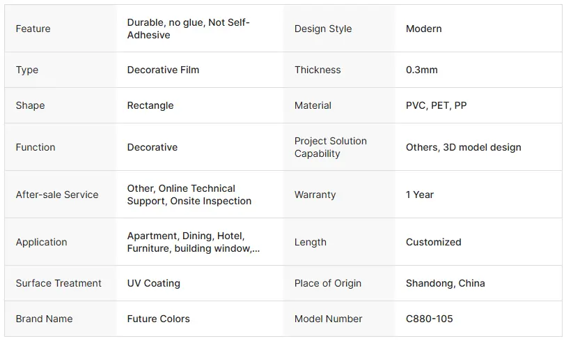 U film di culore solidu mudernu hè un materiale di film di decorativu chì usa plastica alta molecular cum'è u materiale di basa. Dopu à u trattamentu è u revestimentu è u revestimentu, rializeghja a manciaria per mezu di u "Blind process" (molding adporzione vacu). Ci funzioni "culore uniforme, plasticità forte, è altrocità e effaliedzza", è hè assai usatu in i campi cum'è mobili, decorazione, è imballaggi. Hè unu di i materiali cumuni utilizati in u disignu di u stile Memerinista mudernu.