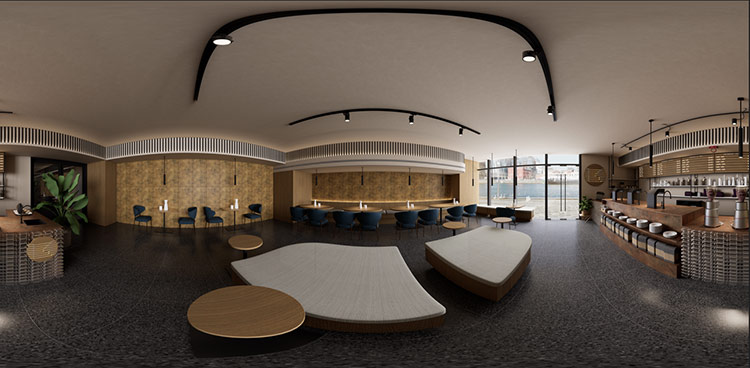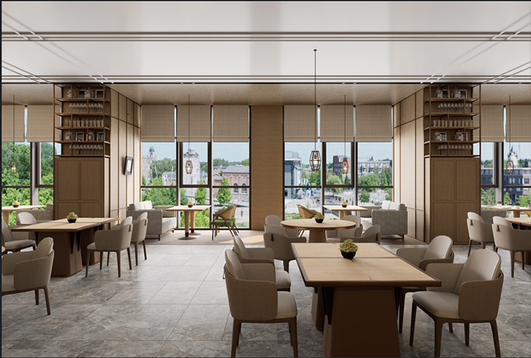* Culori neutri caldi: Toni caramellati chì mischianu marroni rossi cù a mudernità, adattati per creà un ambiente cummerciale nostalgicu.